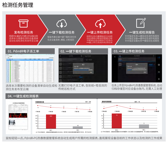 基于FOTRIC 350X云熱像和PdmlR-PG熱像數據管理系統,自動實現設備與檢測數據的關聯存儲。完全剔除了派工單打印、編號記錄。照片診斷分析、照片分類保存。制作報告等耗費大量數據處理成本的環節。