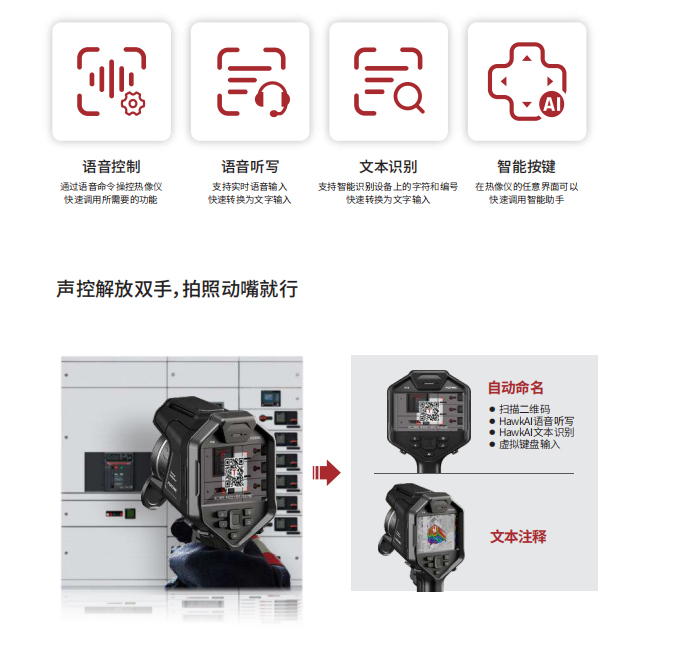 FOTRIC全新推出的HawkAI智能助手,不止具備語音控制、語音聽寫、文本識別和智能按鍵功能,實現自動命名熱像圖,現場快速添加文本注釋。