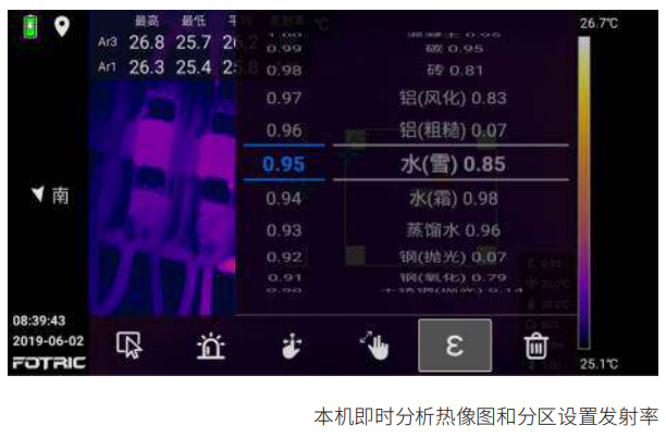 FOTRIC 340系列具備專業的本機分析功能,在檢測現場即可對拍攝的熱像圖片進行專業分析,避免重復拍攝,大幅提高現場診斷效率。同時可以對不同目標區域單獨設置發射率,實現不同材質的準確測溫。