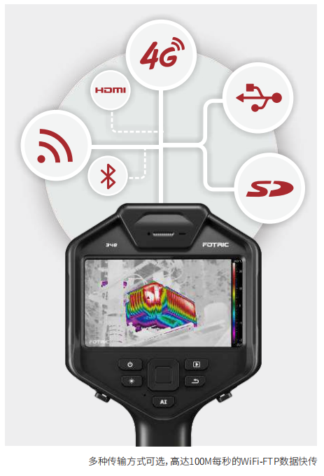 FOTRIC 340系列紅外熱像儀提供豐富的數據傳輸接口,包含WiFi-FTP數據快傳,Type-C USB3.0有線傳輸,高速SD卡傳輸,4G傳輸以及HDMI、藍牙接口。