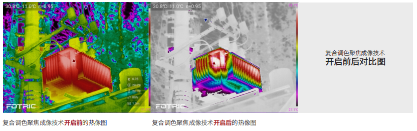 FOTRIC自有的復(fù)合調(diào)色聚焦成像技術(shù),其出色的熱成像效果,非常適用于復(fù)雜場(chǎng)景中分析特定目標(biāo)的細(xì)微溫差,有利于現(xiàn)場(chǎng)快速得出正確的診斷結(jié)論(FOTRIC自有技術(shù))。
