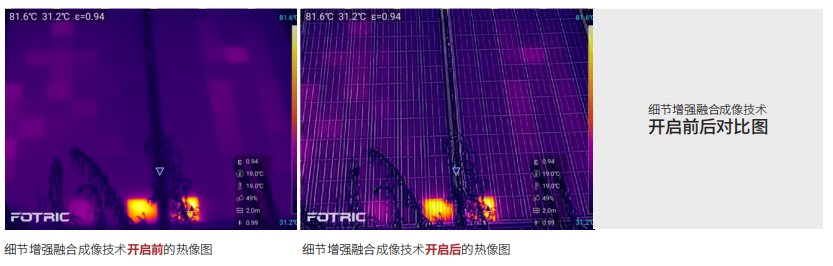 FOTRIC自有的細(xì)節(jié)增強(qiáng)融合成像技術(shù),支持在熱像圖上融合可見光輪廓細(xì)節(jié),輕松定位故障的具體位置(FOTRIC自有技術(shù))。