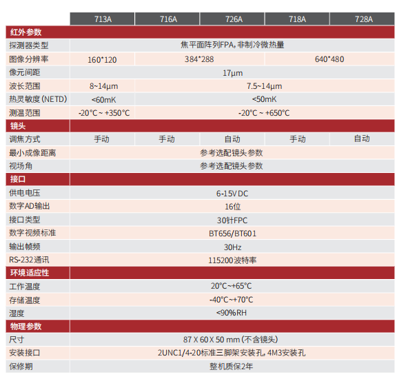 關鍵參數 .支持640*480、384*288和160*120等多種分辨率,可滿足不同應用場景的需求。 產品特點: .支持多種鏡頭。 .高幀頻輸出,成像無拖影 .標準232接口輸出,便于集成 .提供定制化集成服務