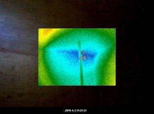 先將屋頂分為幾個區域,在現場操作只需兩名操作人員:一位在樓頂對待確認區域澆熱水,還有一位在房間內對滲漏部位進行熱像跟蹤,當滲漏區域被澆上熱水后,5分鐘內在房間進行熱像跟蹤的人員就可以發現至少0.7℃以上的溫升。