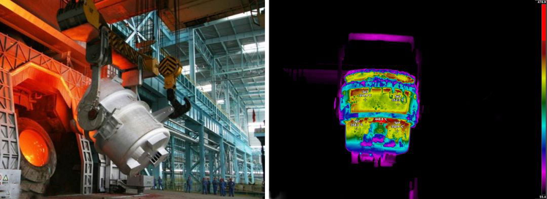 使用FOTRIC熱像儀檢測鋼包表面溫度,即可反推包壁厚度情況,采取相應維護措施,預防穿包。鋼包內部耐火材料,經過高溫鋼水長期侵蝕,將導致包壁厚度減薄,容易造成穿包漏水事故。與此同時,包壁減薄會引起鋼包表面溫度升高。減薄程度越大,表面溫度越高。