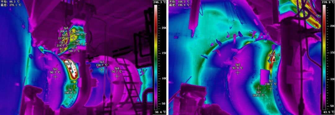 使用FOTRIC熱像儀監測高爐爐體表面溫度,可以客觀體現高爐爐襯的損壞或裂化程度。高爐耐火材料出現裂縫或脫落,爐內高溫鐵水(1350攝氏度左右)就會順著裂縫或者脫落部位直接泄漏到水冷系統、保溫系統、爐壁,嚴重會造成整個高爐報廢甚至人員人生安全。爐襯局部減薄導致會把局部耐高溫材料的高溫通過水冷系統、保溫系統傳遞給爐壁。