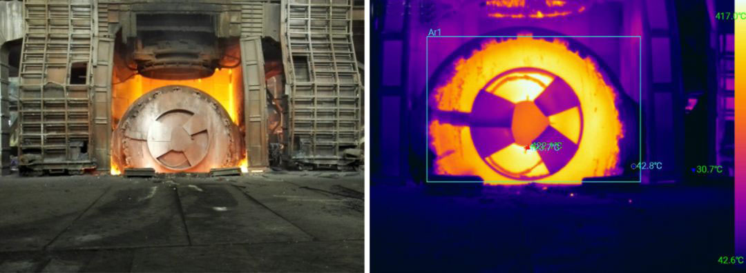 使用FOTRIC熱像儀檢測轉爐表面溫度,便可判斷內部耐火材料狀況,科學監測轉爐預防穿爐。在長時間工作中,轉爐內部耐火材料逐漸受侵蝕、脫落,鋼板直接暴露在高溫環境中,軟化甚至熔蝕,易造成爐底燒穿引起穿爐事故。