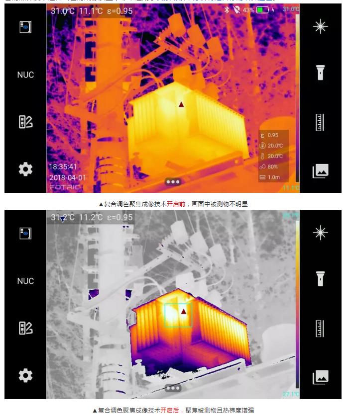 自主研發的“復合調色聚焦成像技術”,能在變壓器本身高溫的強干擾下,仍突出套管輪廓,增強顯示套管的熱梯度,這種出色的成像質量,非常適用于復雜場景中分析特定目標的細微溫差。