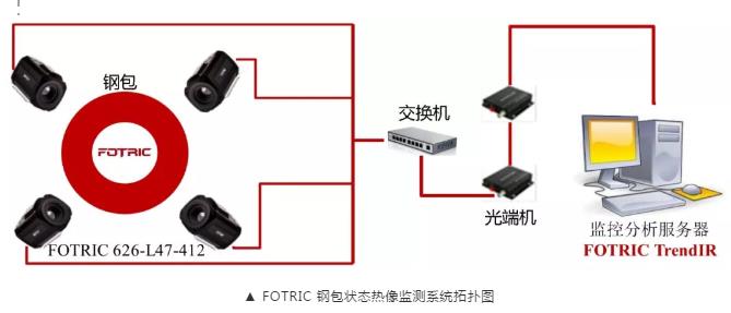 在線熱像儀組網,長期監測鋼包狀態,省心省力。例如Fotric 626組網監測,7×24 小時連續實時監控,可以長期穩定工作;業內強大的智能監控平臺,最高支持 16 路全輻射視頻接入;對于鋼包不同部位和區域,可設置不同的報警閾值進行即時報警。