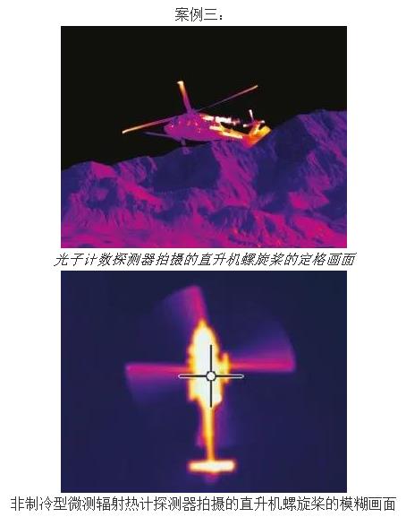 為了進一步說明問題,來看最后一例:測量直升機螺旋槳的熱效應。螺旋槳與空氣之間產(chǎn)生的摩擦會沿著螺旋槳形成一定的熱梯度,越靠近葉片尖端,溫度越高。使用非制冷微測熱輻射計熱像儀,無法有效的定格目標,不能準確地描述和測量真實的溫度。